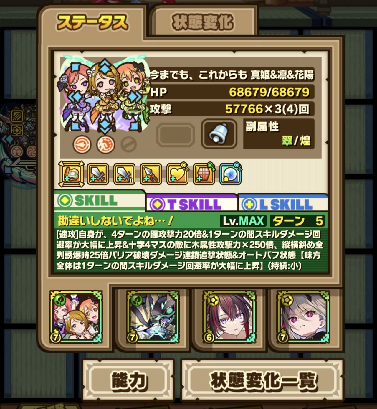 ディジーL→固定、弱点付与・スキブ→変更可能、3人娘になるので、個人的に伸び代を感じるというか、長い目で使っていけそうなキャラになりました。