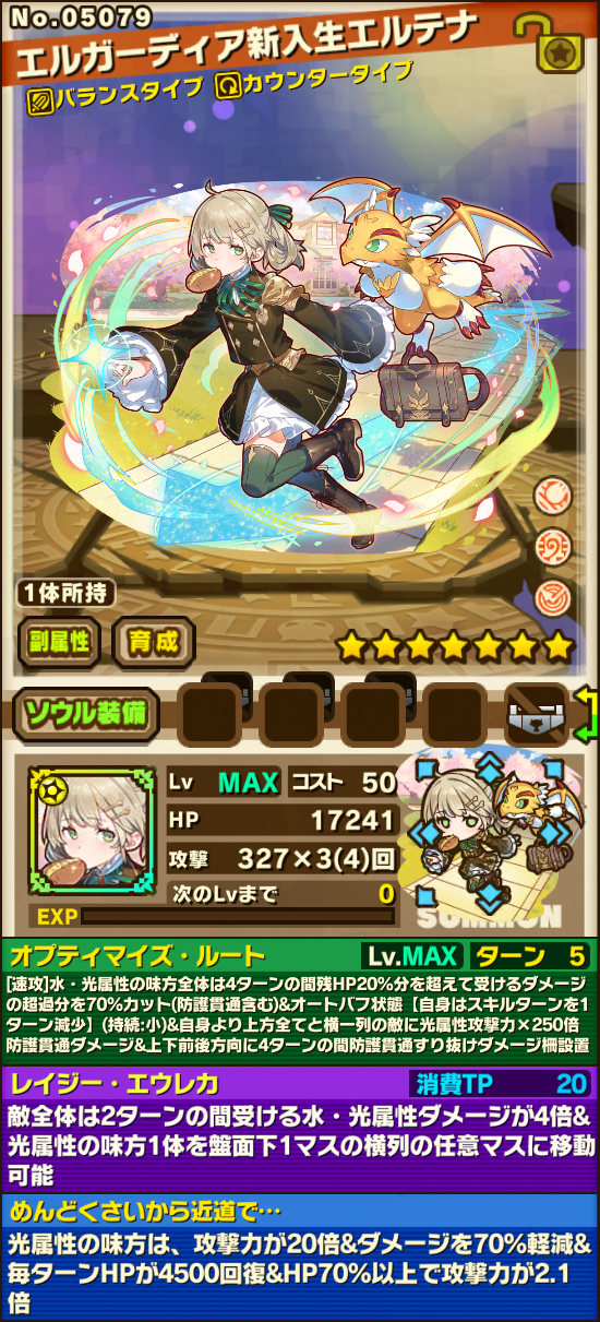 光属性が対象なので他のリーダー候補に比べたら範囲は狭めに見えるけど、それにしたって42倍…そして防御面もめっちゃイカツイ。